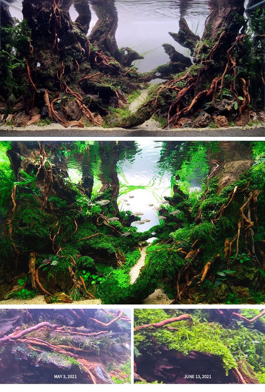 Esta mejora del crecimiento y de la coloración también es patente en plantas epífitas como por ejemplo en las dos variedades de Bucephalandra de la imagen inferior, las cuales presentaron una gran mejora en tan solo dos semanas:
