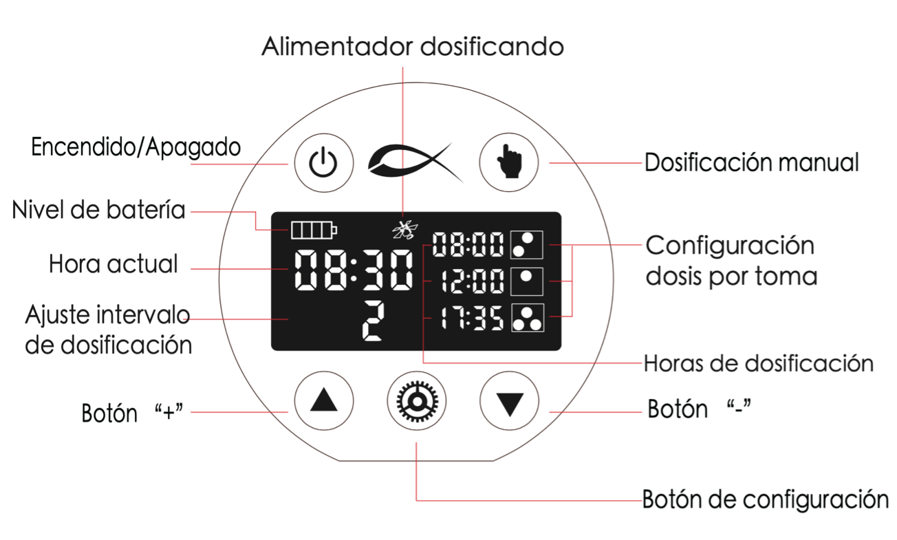 - 🕒 Pantalla LCD intuitiva: Permite programar de forma sencilla los horarios y la frecuencia de alimentación.