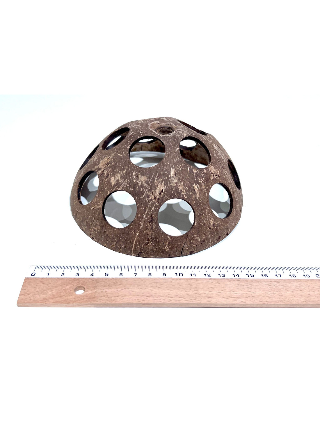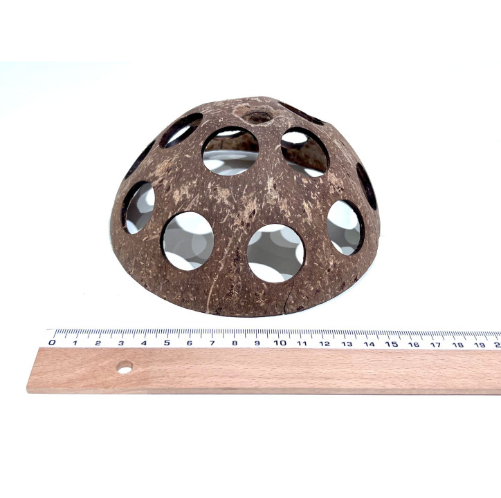 El Coco Cheese de Sakana Botanicals es un refugio natural para acuarios de 10–15 cm de diámetro, diseñado especialmente para peces y gambas. Su forma de media esfera con perforaciones de 15 mm lo convierte en un elemento decorativo funcional, ideal para la creación de escondites seguros dentro del acuario.