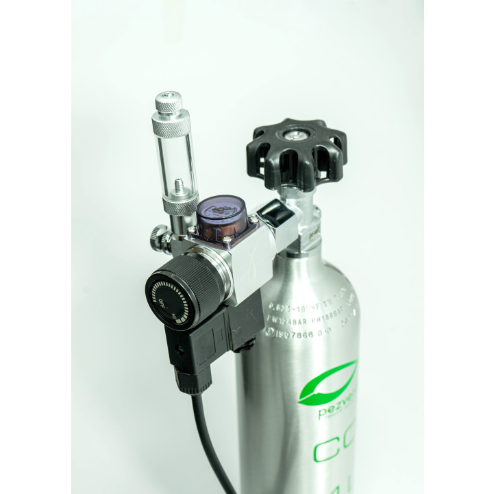 - Manorreductor simple con solenoide PezVerde: permite un control preciso del flujo de CO2 y conexión a temporizador para sincronizar la inyección con el fotoperiodo de tu acuario.