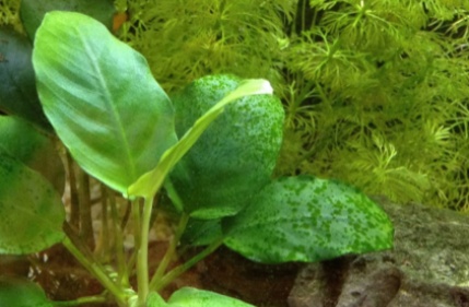 Pequeñas manchas redondas en superficies duras, suelen ser más visibles en el vidrio del acuario. También aparecerán en plantas de crecimiento lento, típicamente en las Anubias. Son las algas carcterísticas de acuarios saludables, probablemente verás algunas en todos los acuarios.