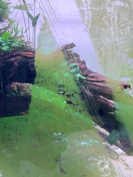 Las manchas verdes realmente pequeñas forman una capa parecida al polvo en el vidrio del acuario, maderas y rocas.
