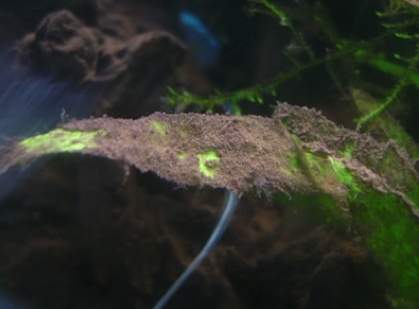 Indica que las plantas están sufriendo (las hojas se pudren localmente) debido principalmente a la deficiencia de nutrientes (por ejemplo, la falta local de CO2 que no se distribuye uniformemente por el flujo en todo el acuario). Puede aparecer en hojas viejas y dañadas. Los comedores de algas y las gambas amano lo comerán.