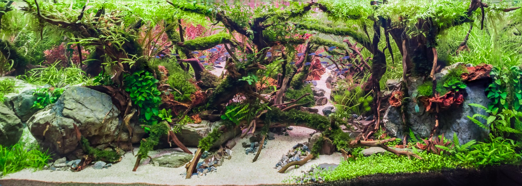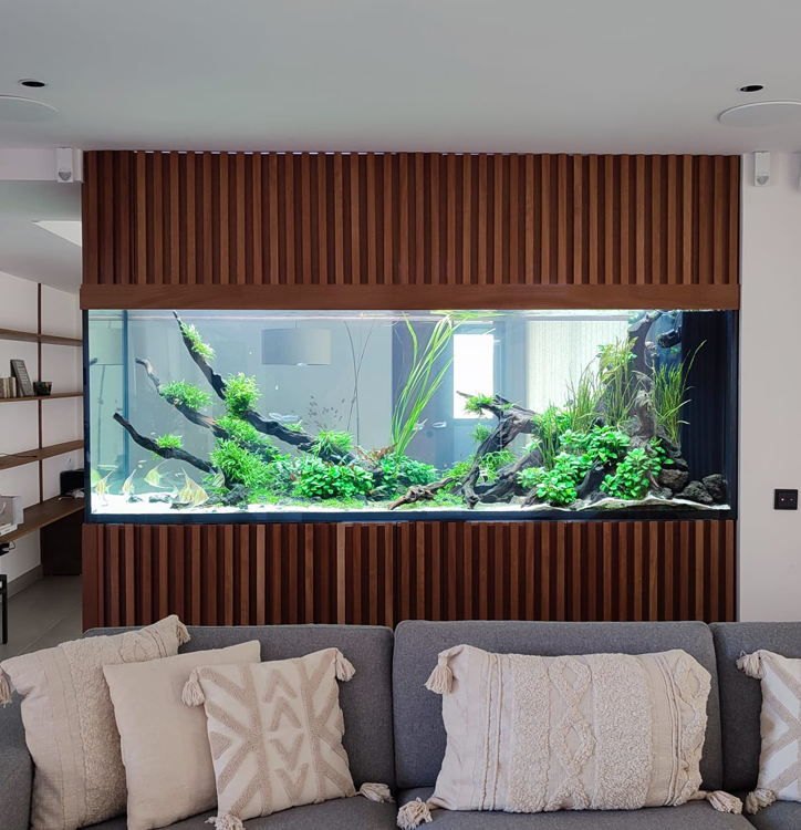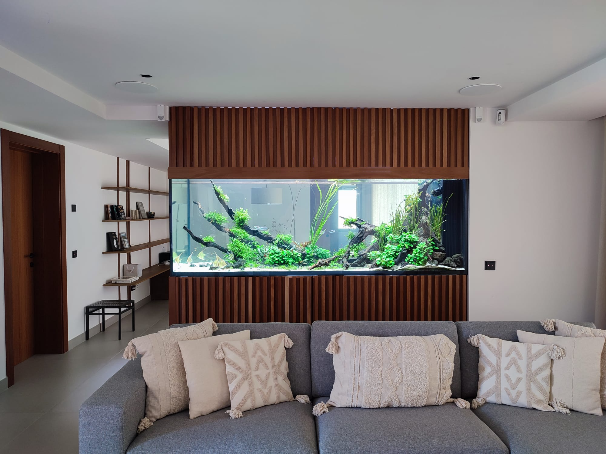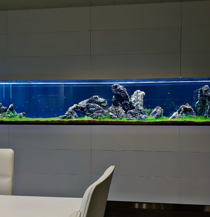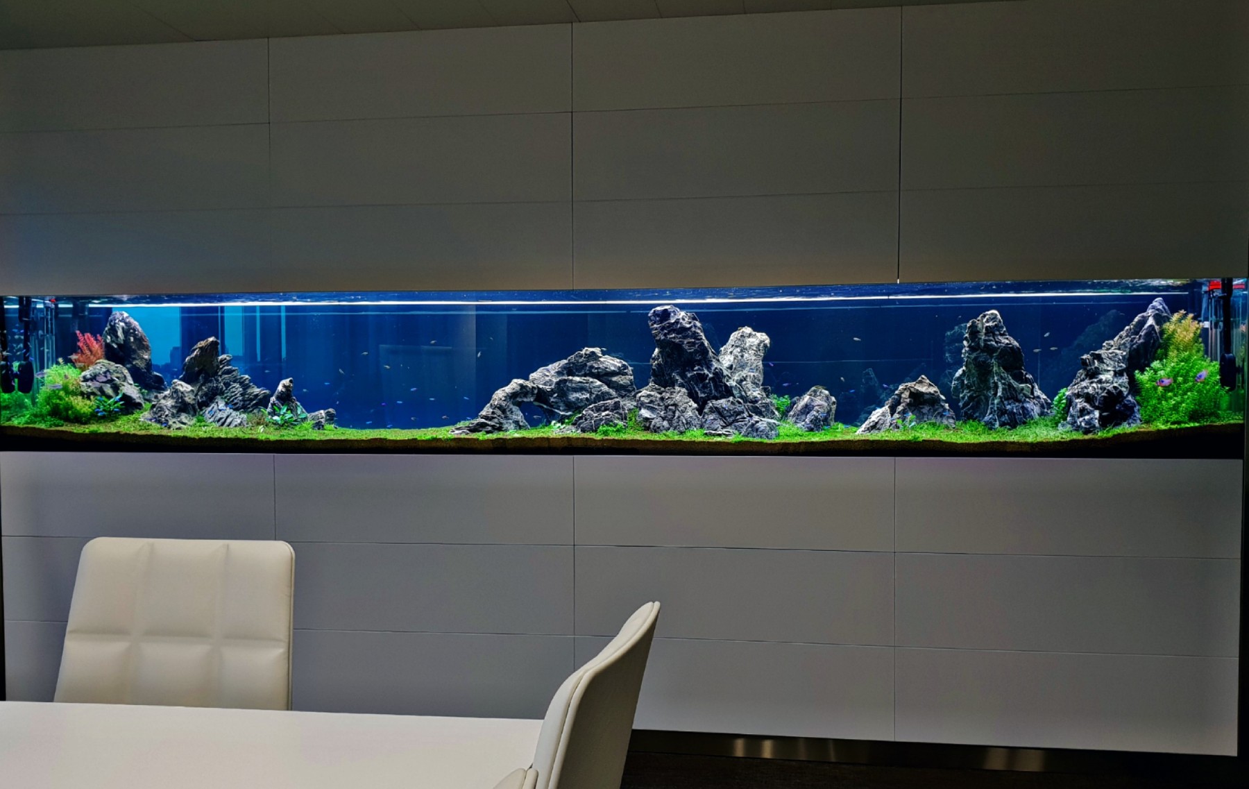 Este proyecto de casi cinco metros de longitud fue el primer acuario de gran envergadura que montamos. Fue encargado para la sede de una empresa y buscaban aportar un toque de naturaleza a sus oficinas.