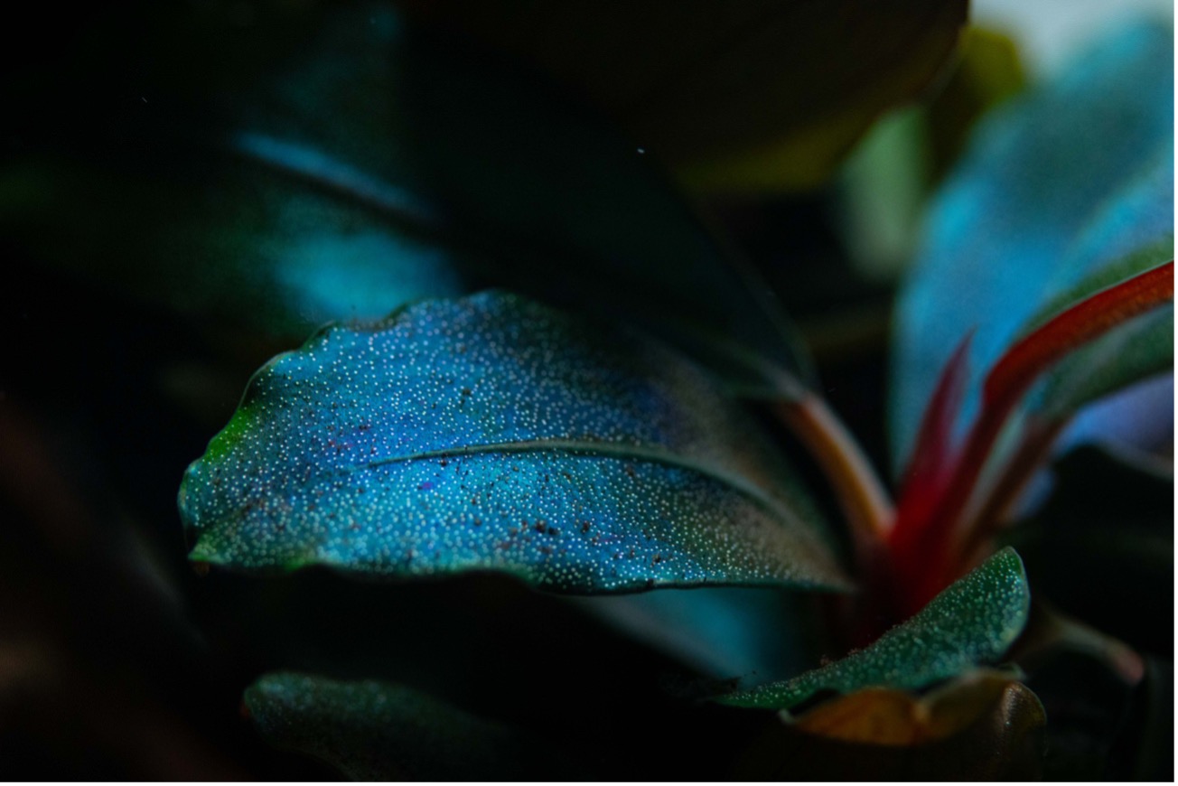Luz: La Bucephalandra Sordidula Blue tolera prácticamente todo tipo de condiciones de luz. Con luces de baja potencia oscurecerá sacando tonos verdes y azulados con puntos blancos y produciendo hojas más grandes mientras que con luces intensas las hojas serán más pequeñas.