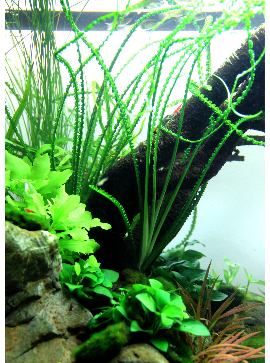 Con una altura aproximada de 20 – 30 cm en la base y hojas que se extienden hacia la columna de agua, esta planta resulta ideal para la zona trasera o central del acuario, donde se convierte en un punto focal de gran atractivo visual.