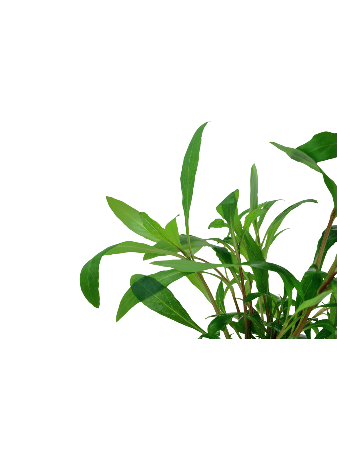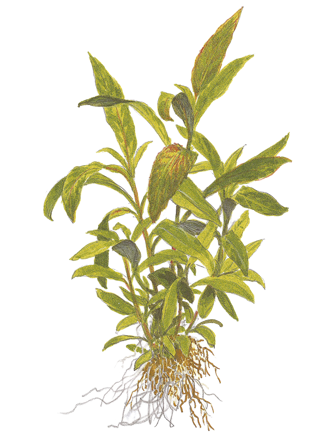 Color: Se caracteriza por su tallo marrón rojizo y hojas claras dentro del agua con nervios verdes.