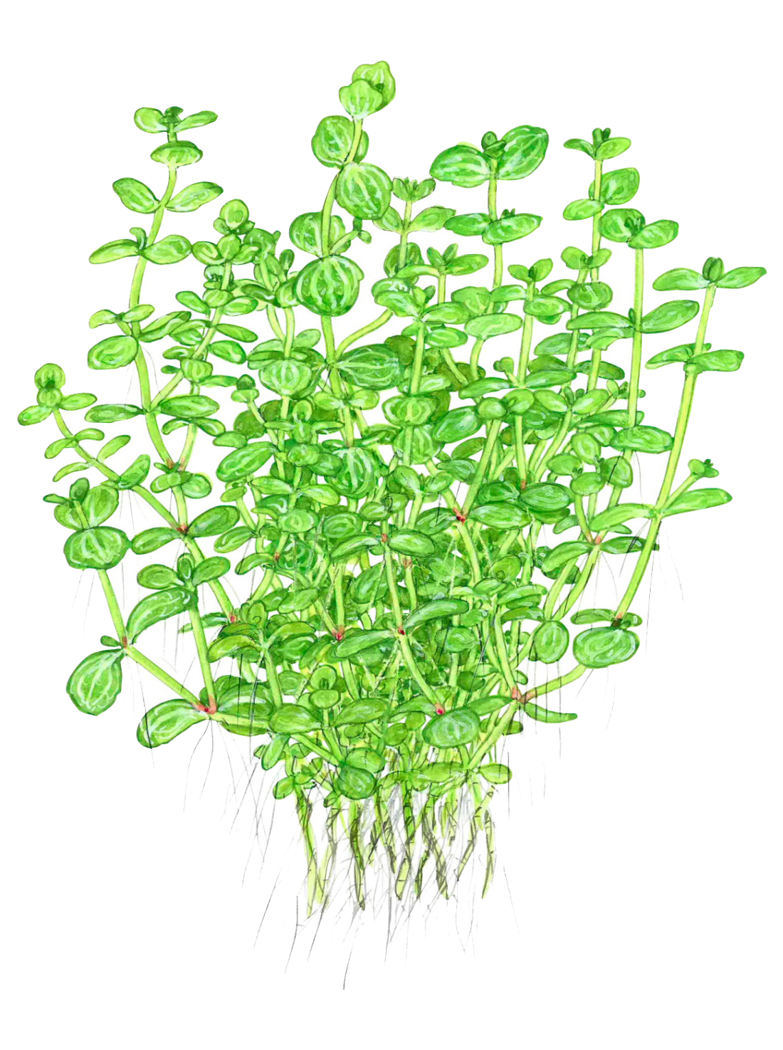 Dimensiones: Hemos mantenido la Lindernia rotundifolia en alturas que van desde los 3cm hasta más de 50. Es una planta que con las condiciones adecuadas puede incluso emerger del agua. Sus hojas son redondeadas y tienen un tamaño máximo de en torno a 0,8cm.