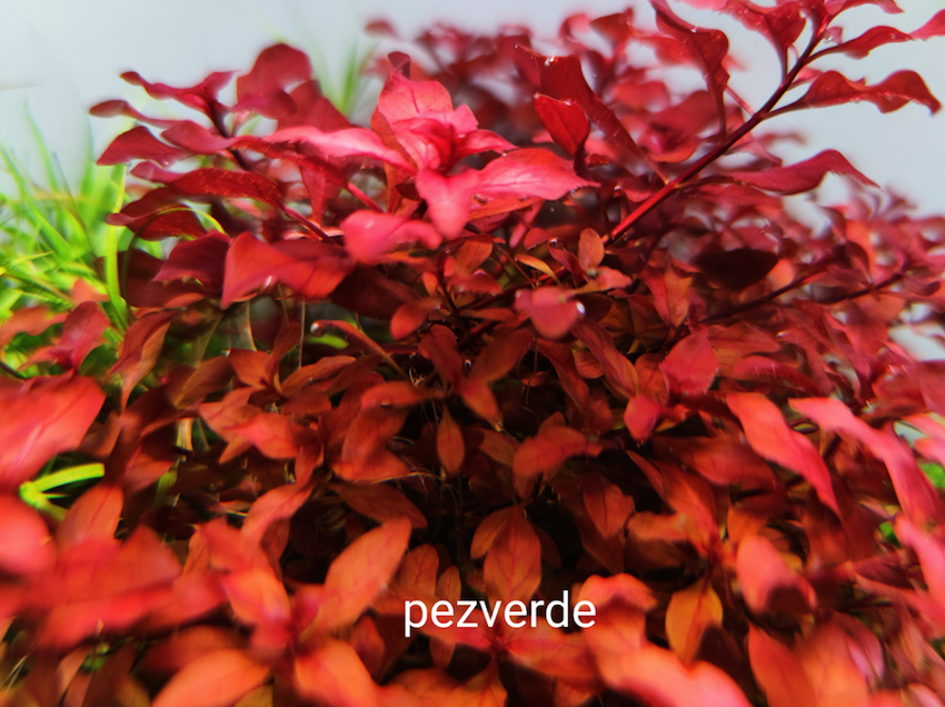 Color: Se caracteriza por su tallo rojizo y hojas verdes con nervios rojizos ante escasa luz y hojas muy rojas con luz intensa.