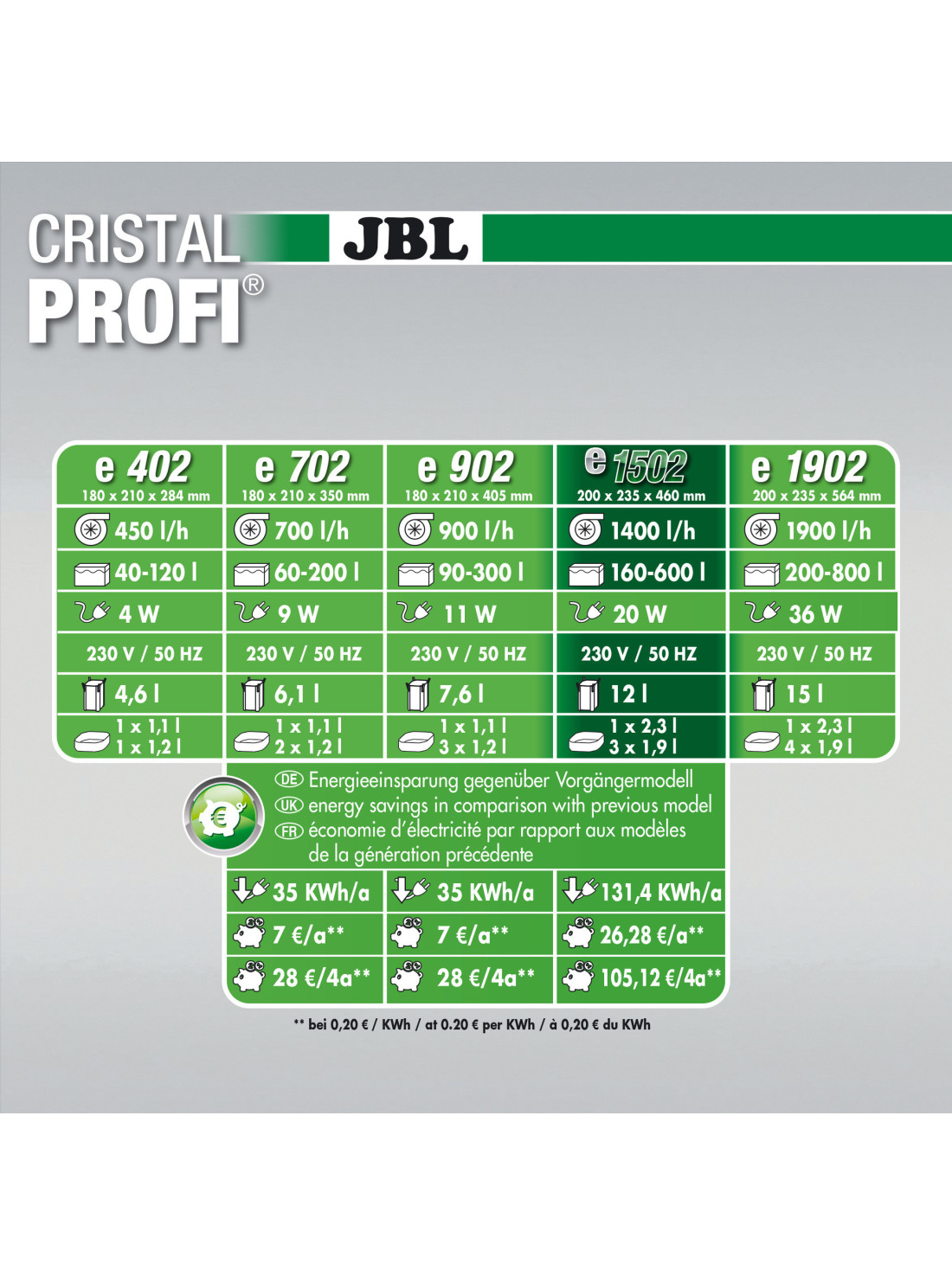Con el JBL CristalProfi E-1502 disfrutarás de un filtro externo silencioso, potente y eficiente, perfecto para mantener un ecosistema equilibrado y saludable en tu acuario.