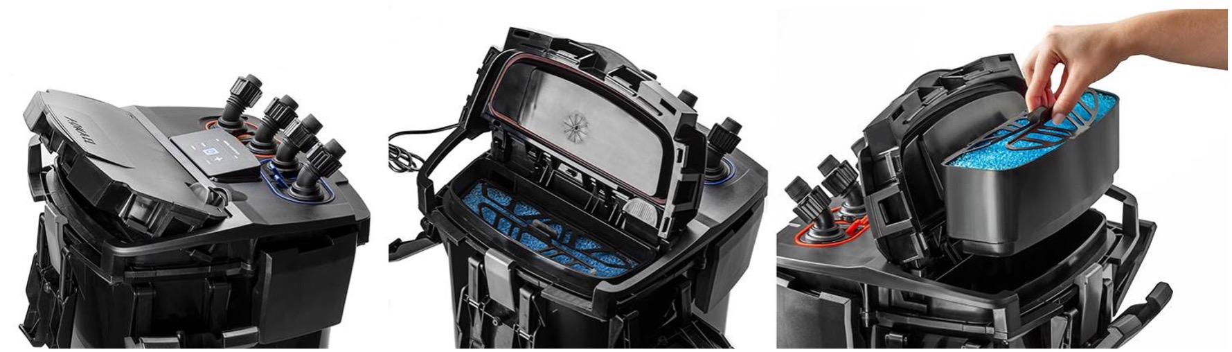 Prefiltro integrado: Los HyperMAX incorporan un prefiltro integrado único en el mercado. Este tiene una capacidad de 1,5L y contiene una esponja especialmente diseñada para capturar las impurezas y residuos que pueda contener el agua absorbida de forma que no pasen a la zona de filtro donde se encuentra el material biológico. Este sistema protege al filtro contra atascos reduciendo por tanto la frecuencia de limpieza de mismo. En su lugar simplemente deberemos limpiar periódicamente la esponja del prefiltro bajo el grifo lo cual es muy sencillo de hacer ya que no requiere desacoplar el filtro de su emplazamiento.