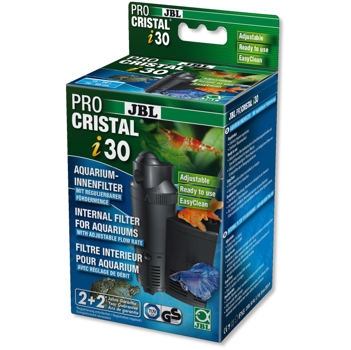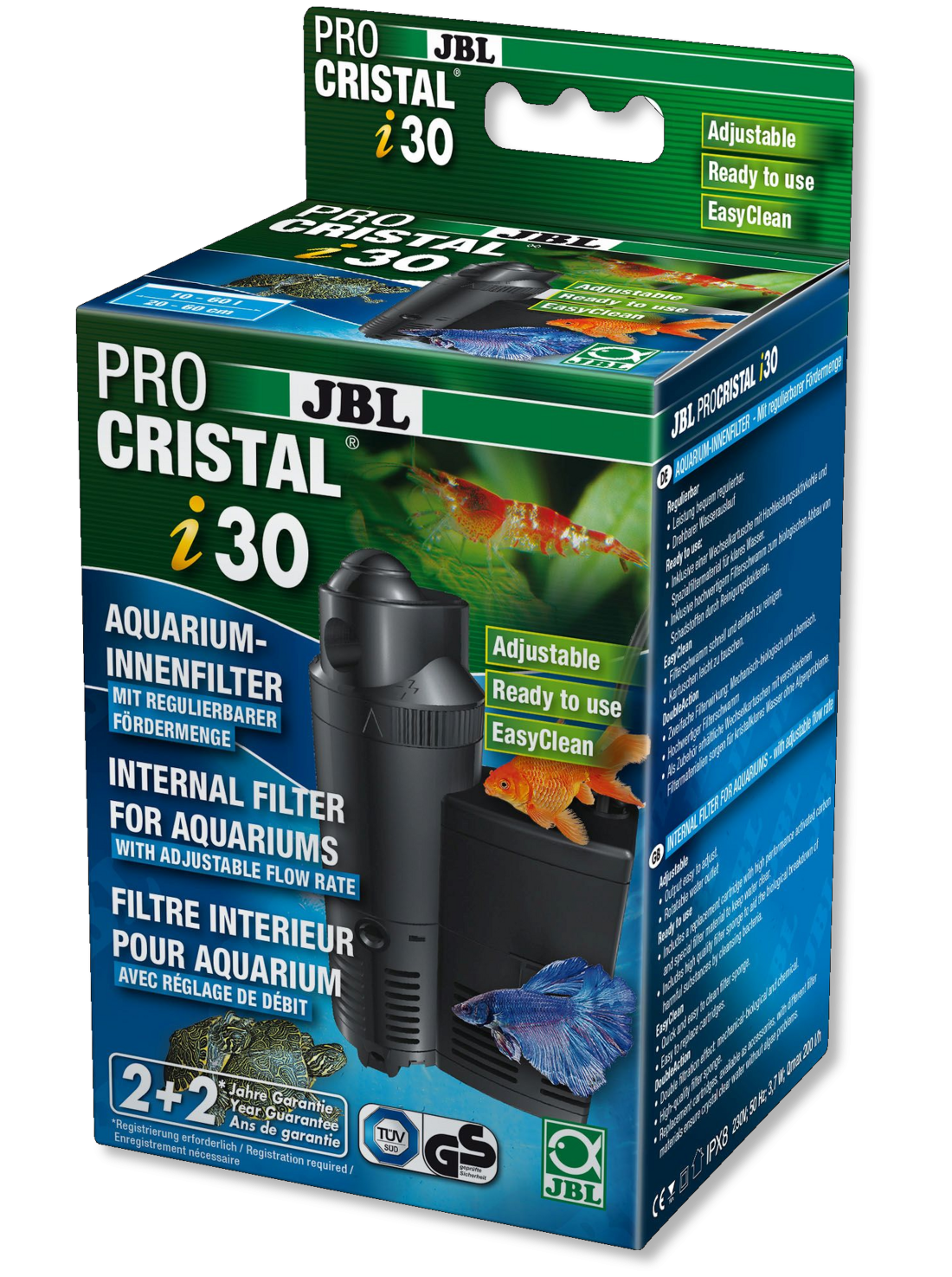 El JBL ProCristal i30 es un mini filtro interno de alto rendimiento diseñado para mantener el agua de tu acuario cristalina, oxigenada y libre de impurezas. Con una potencia de 3,7 W y un caudal regulable de hasta 200 L/h, es la solución ideal para acuarios pequeños de 10 a 40 litros, incluidos los nano acuarios y gambarios.