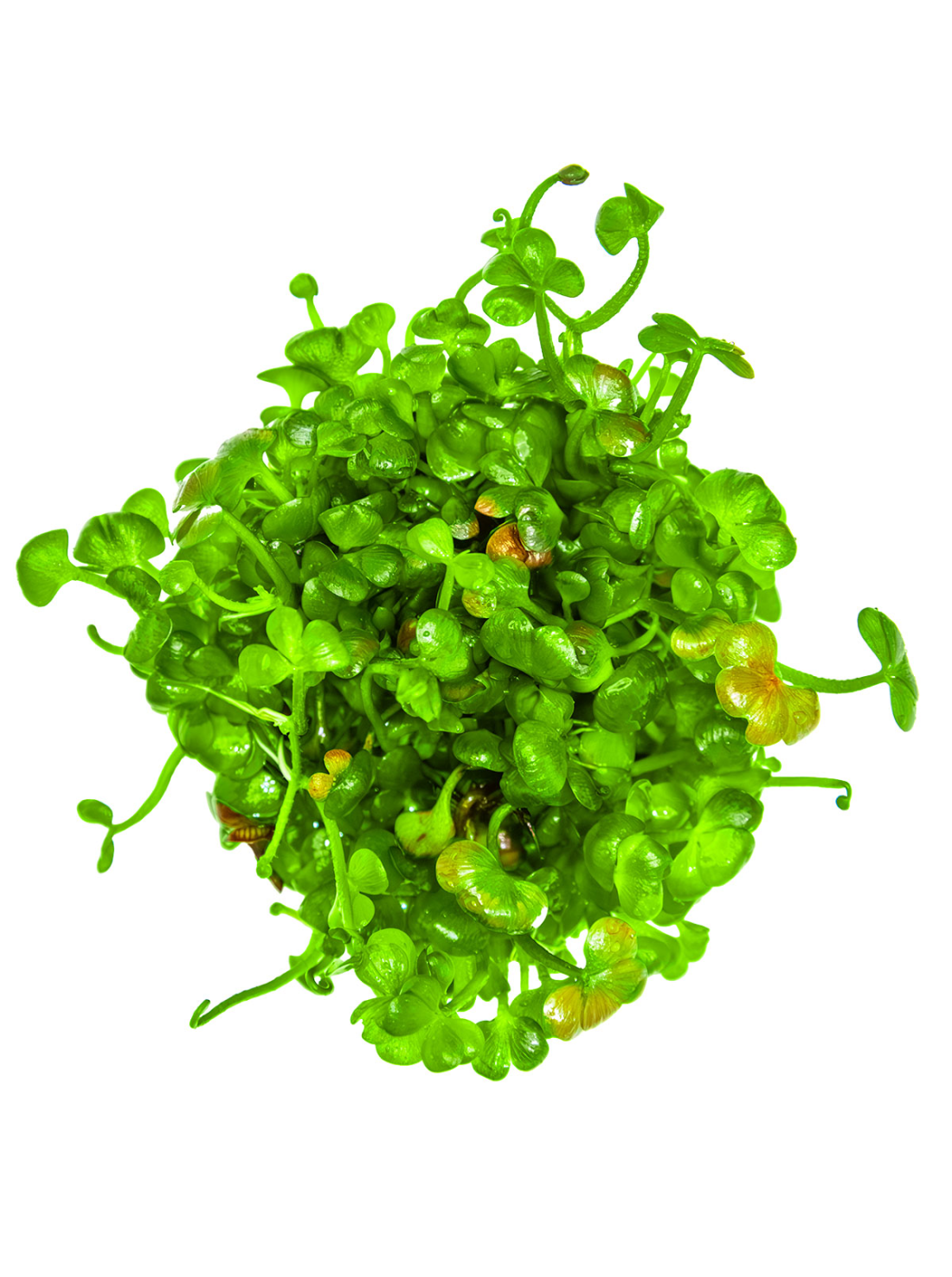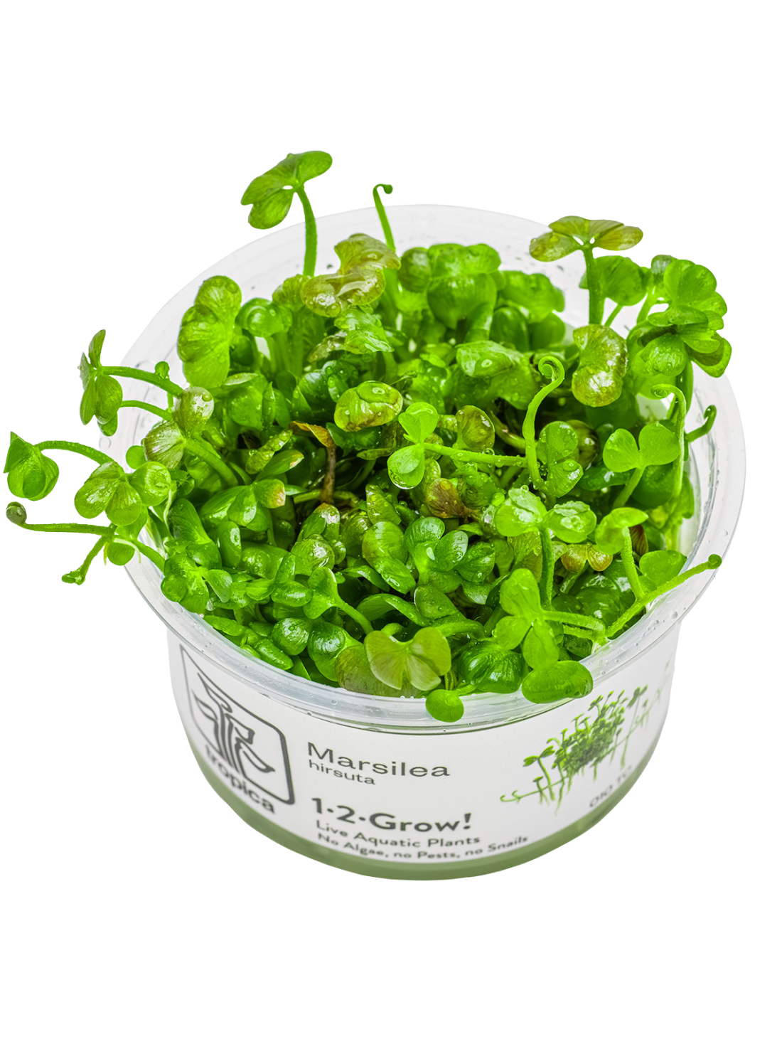 Dimensiones: Puede alcanzar alturas de hasta 10 cm en un acuario si bien lo normal es mantenerla sobre los 4 cm. Las hojas tienen un diámetro de 1,5 cm y se caracterizan por su disposición en forma de trébol.