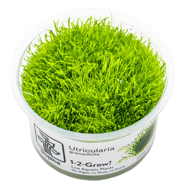 La Utricularia graminifolia es una planta acuática originaria de Asia, muy apreciada en el mundo del aquascaping por su aspecto único y su naturaleza especial: se trata de una planta carnívora, capaz de alimentarse de pequeños microorganismos presentes en el agua. Esta característica, junto con su delicada forma de césped fino, la convierte en una de las tapizantes más originales y buscadas para acuarios naturales.