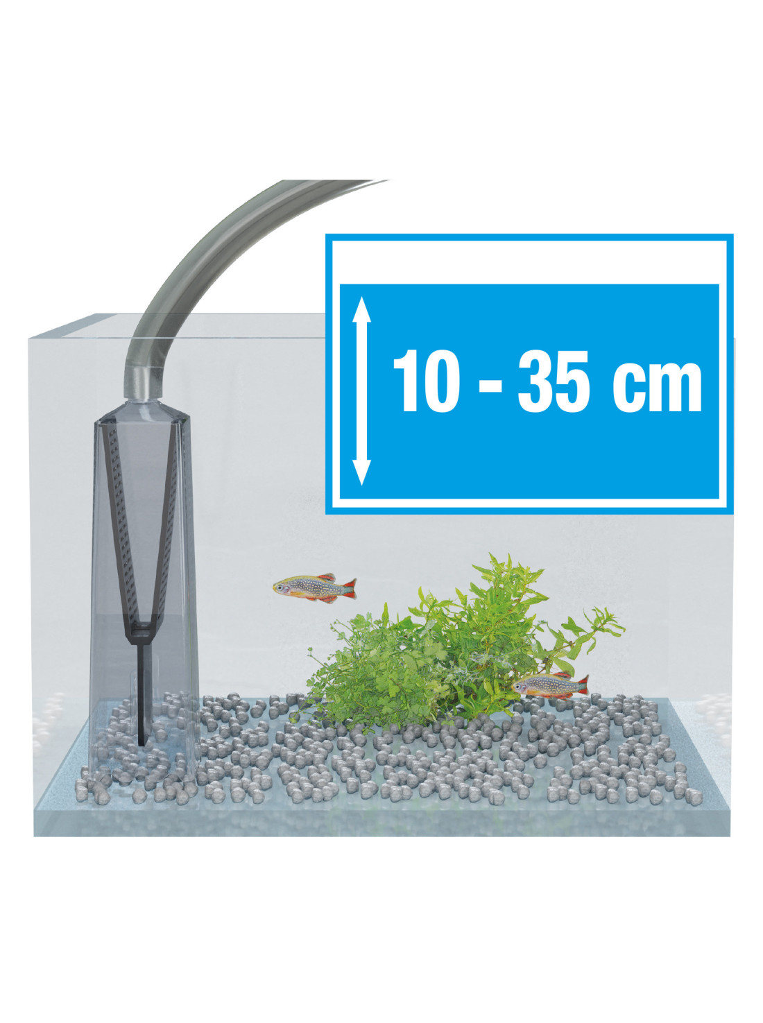 Su funcionamiento es muy sencillo: basta con sumergir el sifón en el agua, succionar brevemente el tubo y dejar que el flujo de agua comience hacia el cubo. Una vez en marcha, se introduce el sifón en el sustrato para retirar restos de comida, excrementos y desechos orgánicos.