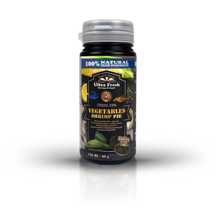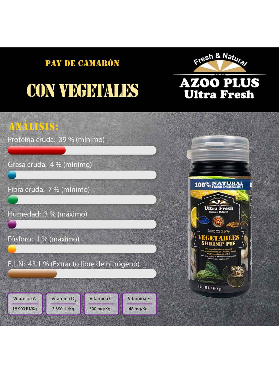 El AZOO Ultra Fresh Vegetables Shrimp Pie 120 mL es el alimento vegetal definitivo para peces de fondo herbívoros: natural, nutritivo, altamente palatable y diseñado para mantener el agua limpia mientras se consume lentamente.