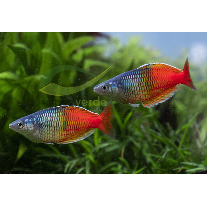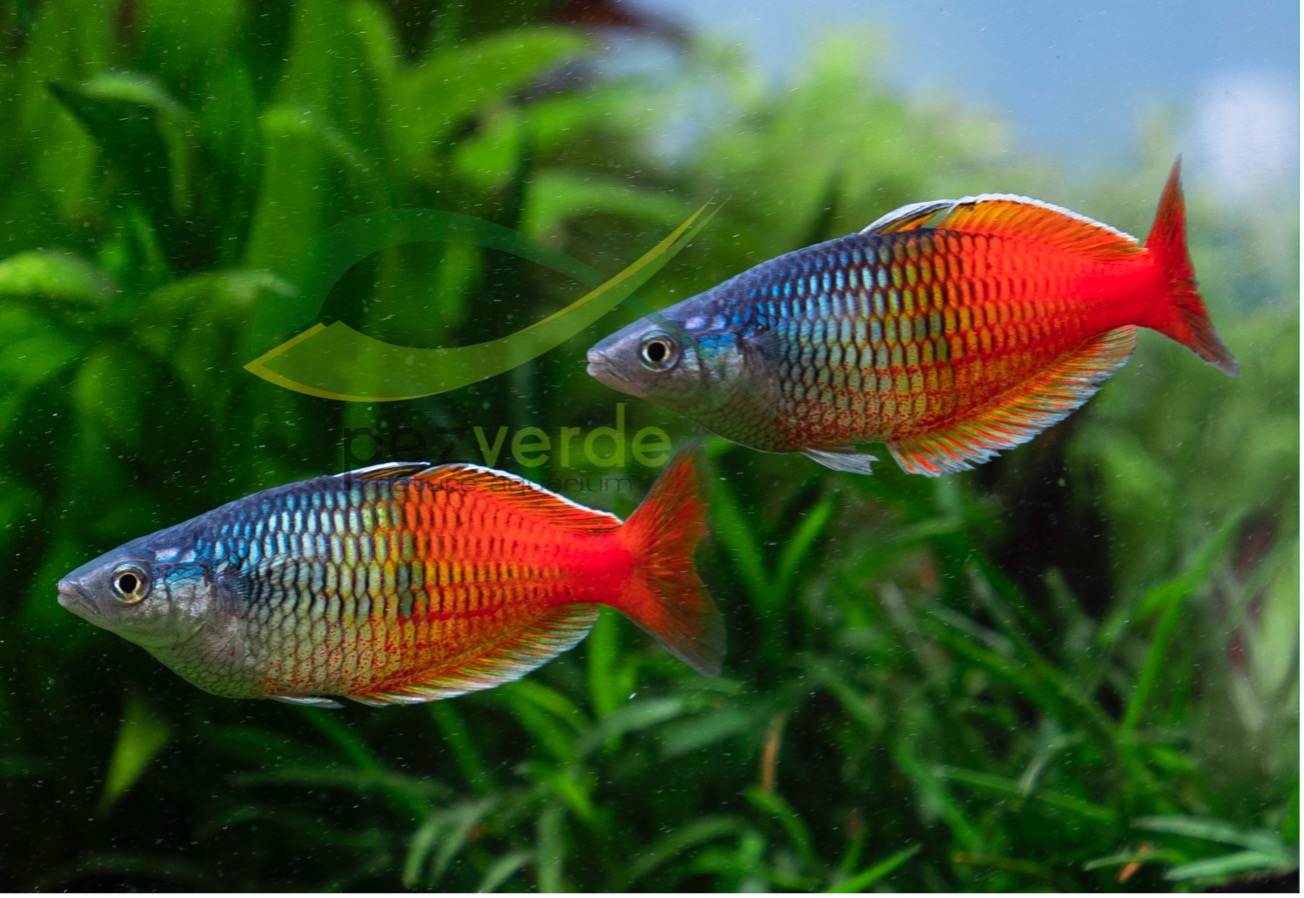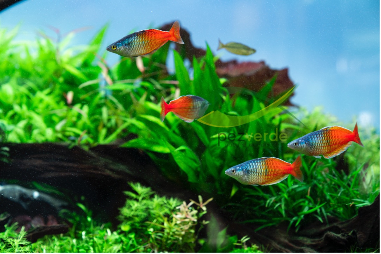 Tipo de acuario: No recomendaríamos mantener Melanotaenias en acuarios de menos de 120cm de largo ya que son peces de un tamaño considerable y bastante poco estáticos. Recomendamos un acuario densamente plantado y con una buena calidad del agua en el que se dejen zonas libres de plantas y hardscape para que puedan nadar a gusto.