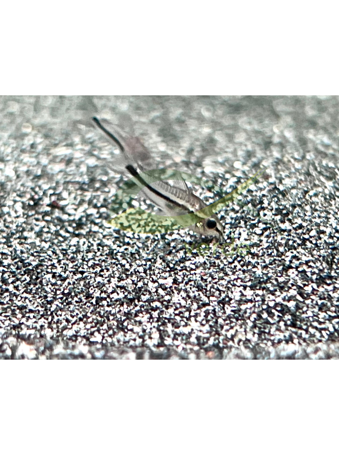 Tamaño y dimorfismo sexual: Es una de las Corydoras de menor tamaño junto con la Habrossus. Los ejemplares adultos no superan los 3 cm. Las hembras tienden a crecer más y a ser más anchas que los machos, especialmente en época de cría.