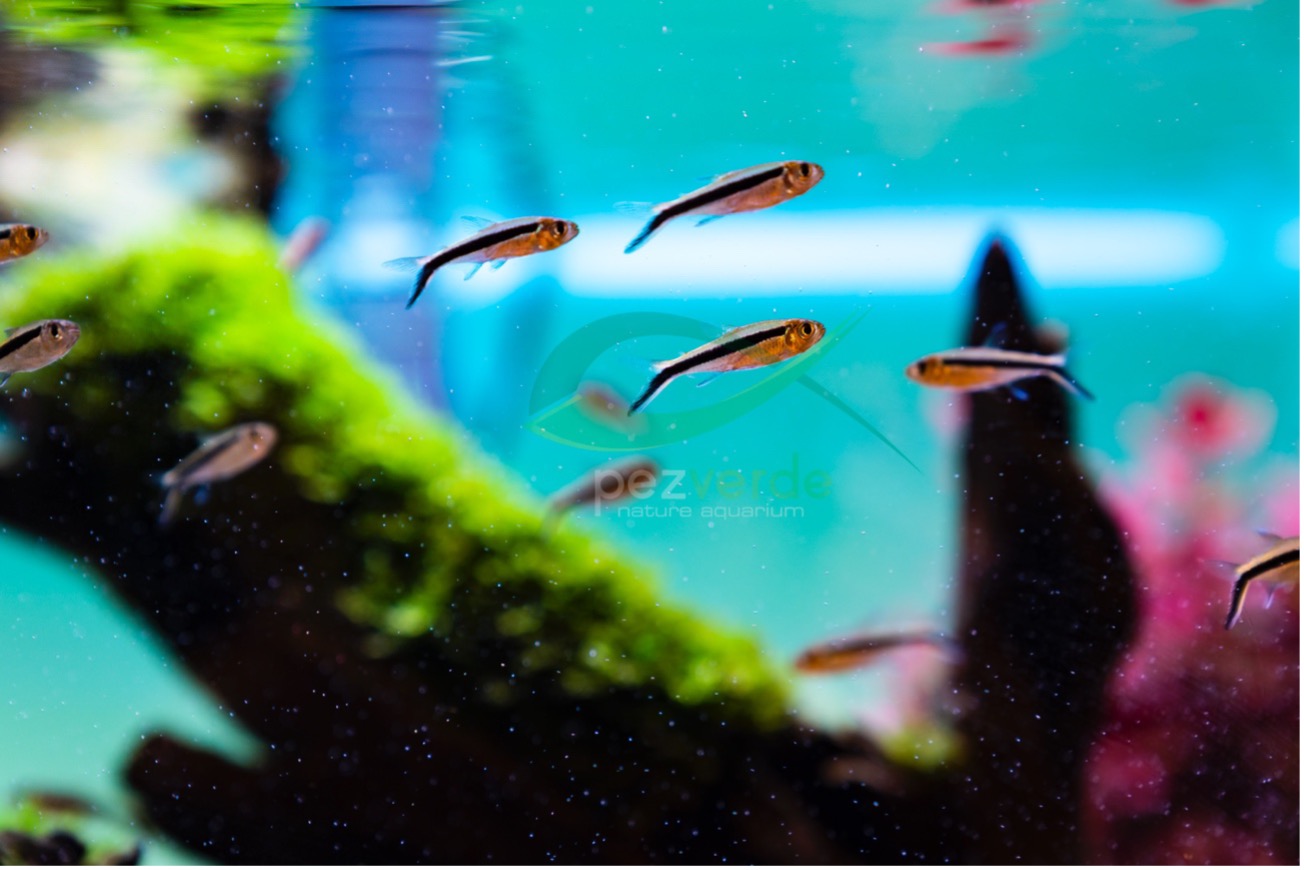 El acuario puede ser sencillo (Arena y unas ramas con luz tenue) o un plantado denso donde se dejen algunas zonas para el nado del cardumen.