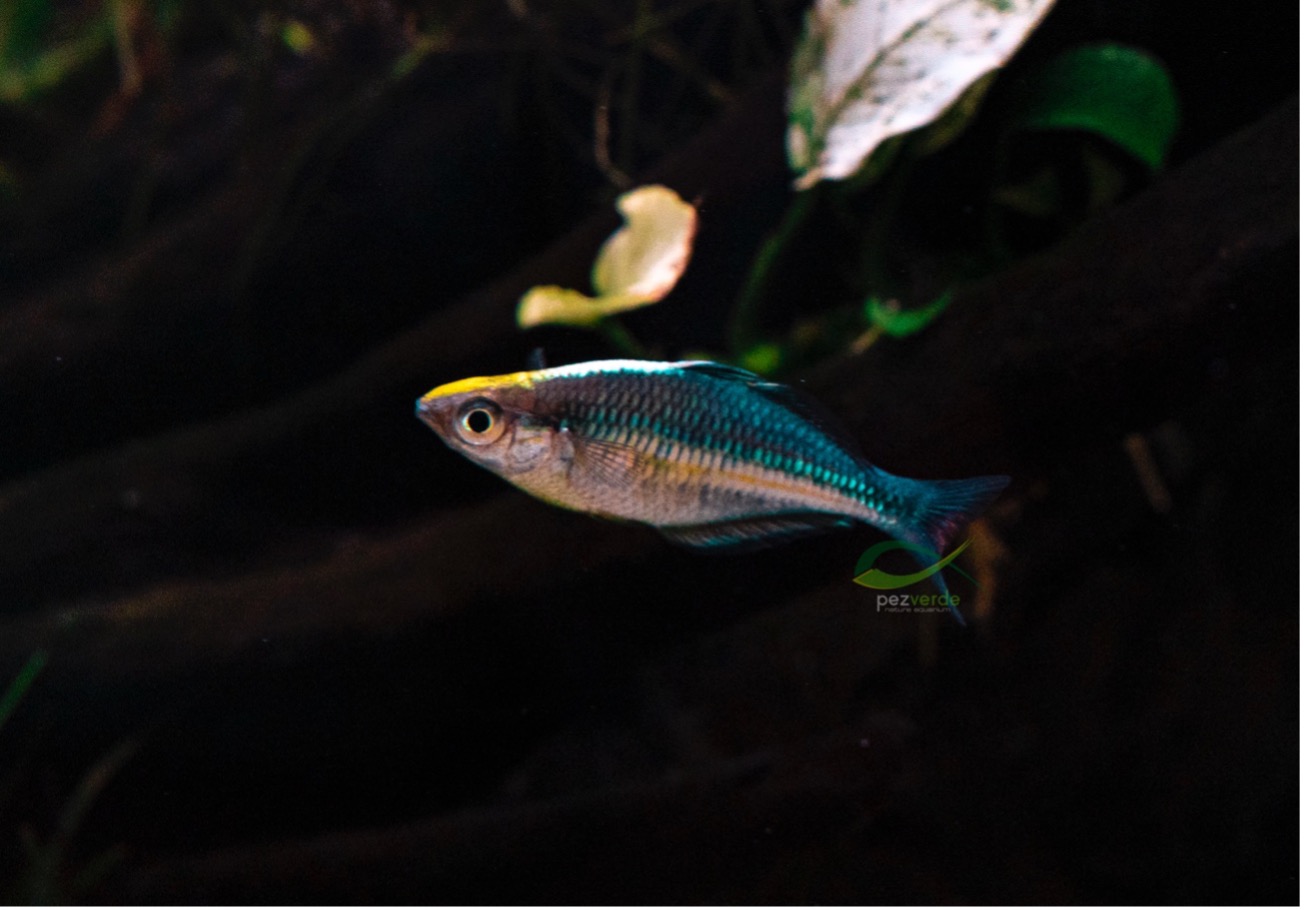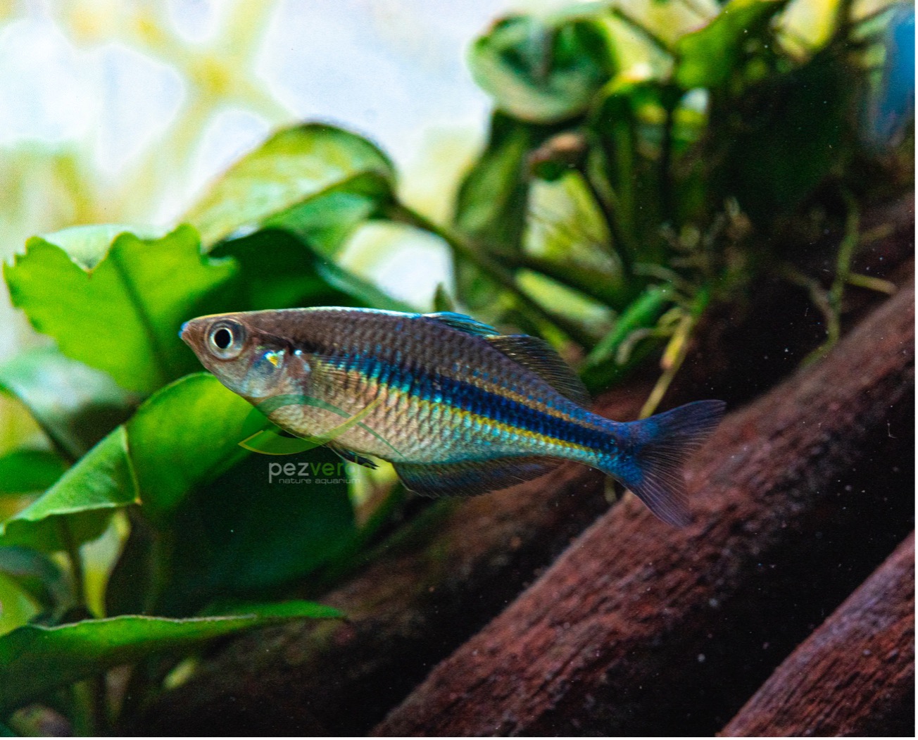 Tipo de acuario: No recomendaríamos mantener Melanotaenias en acuarios de menos de 120cm de largo ya que son peces de un tamaño considerable y bastante poco estáticos. Recomendamos un acuario densamente plantado y con una buena calidad del agua en el que se dejen zonas libres de plantas y hardscape para que puedan nadar a gusto.