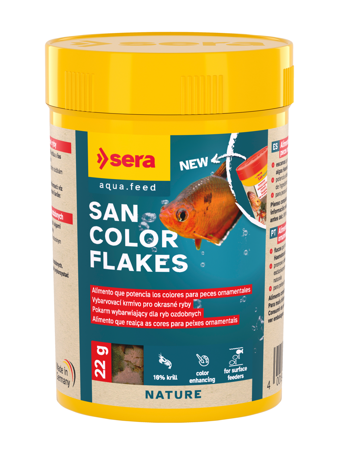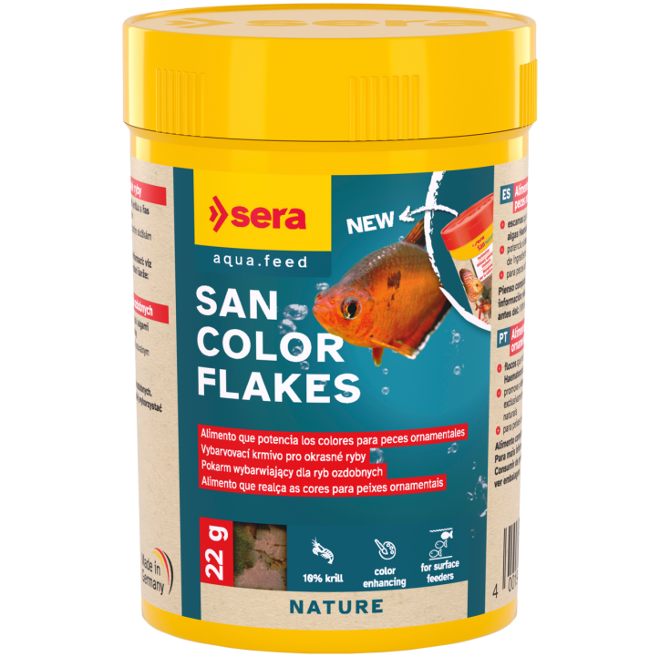 Con SERA SAN Color Flakes 100mL tus peces recibirán un alimento completo, nutritivo y natural que resalta su belleza y contribuye a mantener un acuario sano y equilibrado.