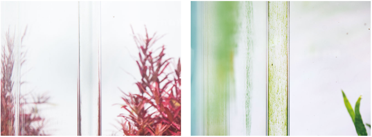 En las imágenes inferiores podemos ver dos ejemplos de acuarios que fueron montados de manera simultánea y con equipamientos similares. Las fotografías fueron tomadas 30 días después del montaje. El de la izquierda fue tratado en ese mes con NEO Guard y como se puede apreciar se encuentra libre de algas mientras que el de la derecha no recibió tratamiento. Es por ello que el uso de NEO Guard puede resultar realmente interesante en acuarios que usen pipas transparentes ya que el uso de este producto permitirá espaciar más la limpieza de las mismas.
