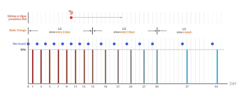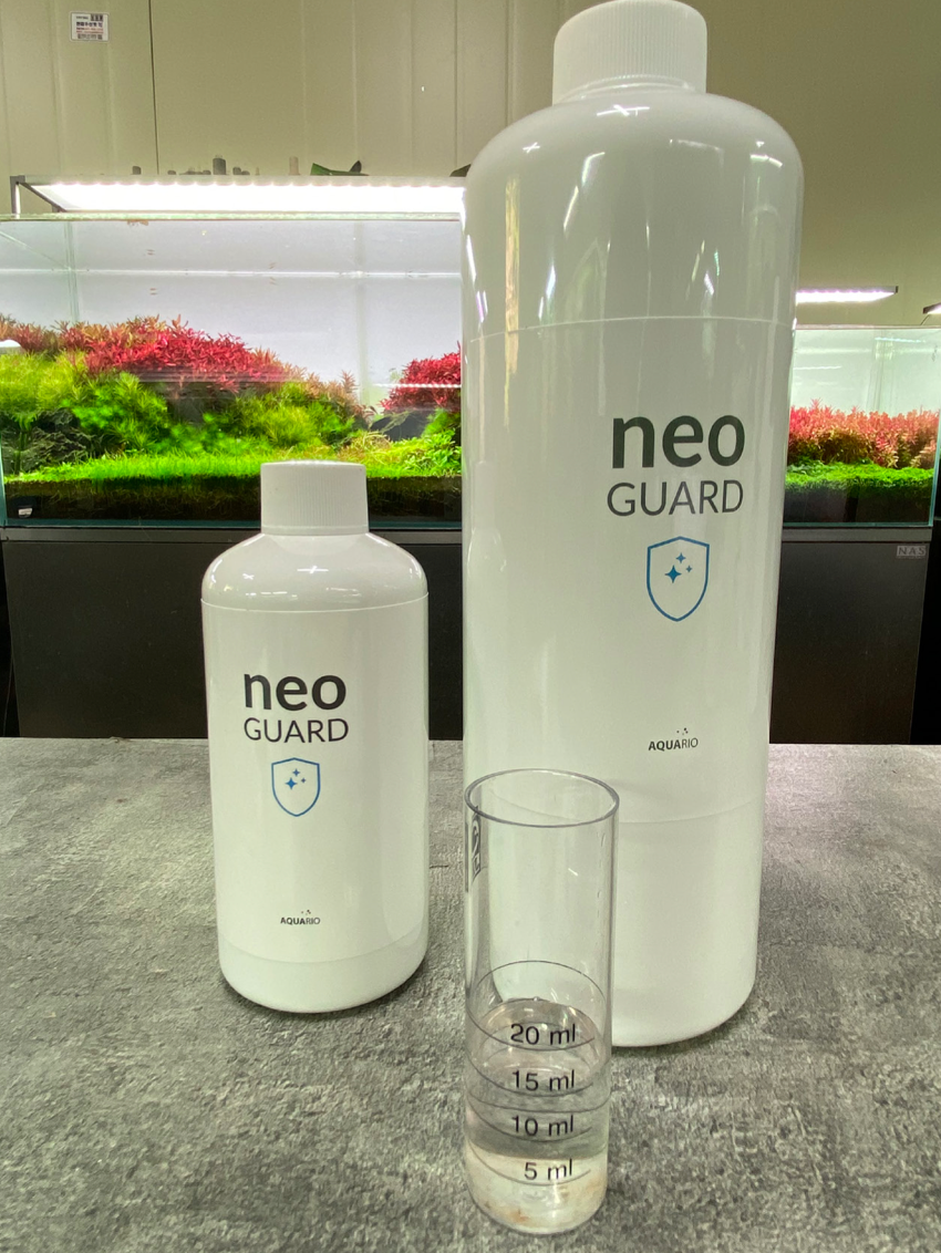 - Para uso rutinario en un acuario maduro se recomienda agregarlo el día anterior al cambio de agua a razón de 5mL de NEO Guard por cada 60L de acuario.