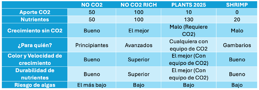 3) En el caso de acuarios donde no se disponga de CO2 pero se quiera ampliar el abanico de plantas a mantener deberemos ir al NO CO2. En caso de acuaristas noveles que no quieran correr riesgos pueden optar por la versión Standard y aquellos que sin tener CO2 quieran obtener el máximo rendimiento pueden ir a por la versión RICH.